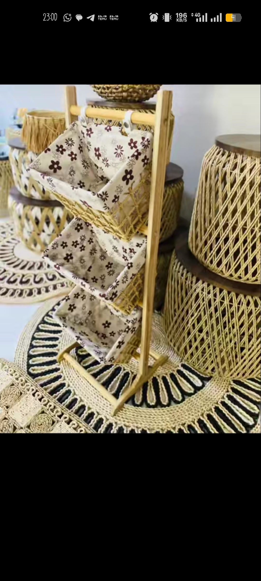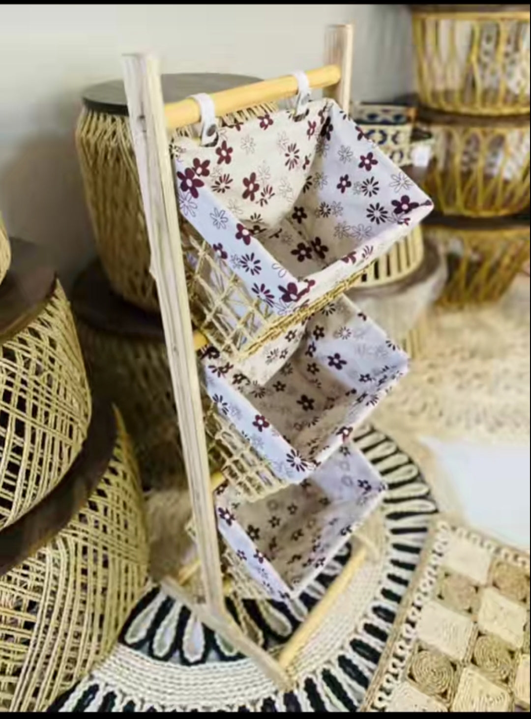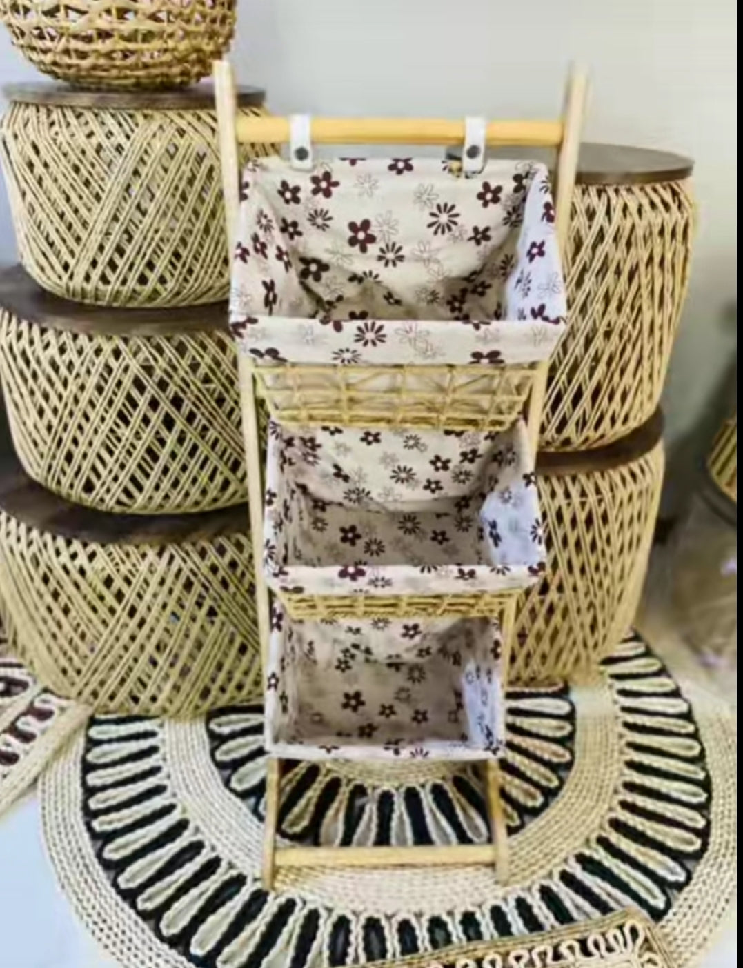 Organisateur élégant à trois paniers en osier naturel, doublés d’un tissu floral raffiné. Idéal pour ranger les fruits, légumes ou petits objets du quotidien. Sa structure en bois solide apporte une touche chaleureuse et naturelle à votre intérieur.