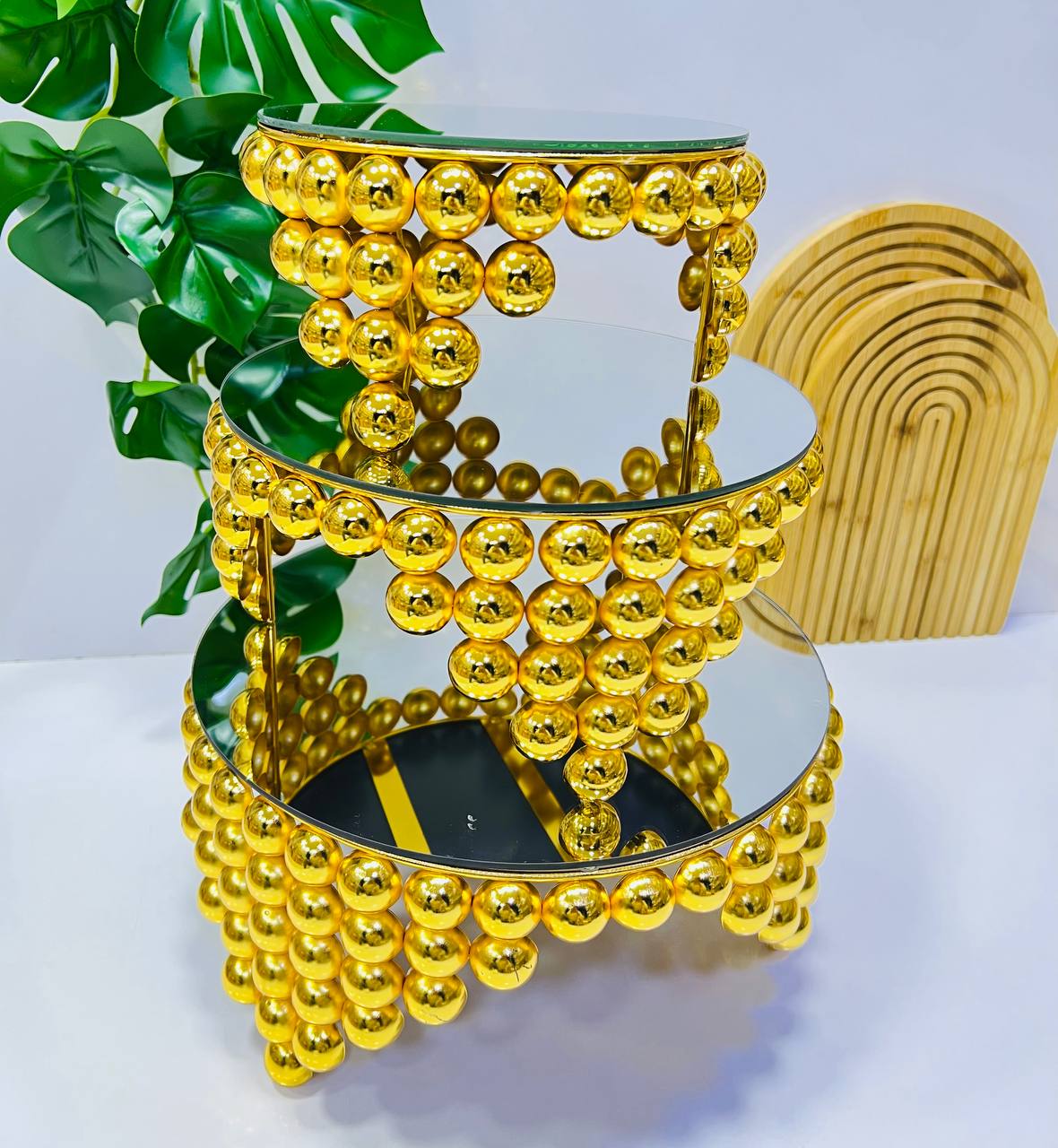 Plateaux décoratifs dorés à trois niveaux, au design moderne et luxueux, parfaits pour présenter vos gâteaux, desserts ou pour décorer votre table avec élégance.