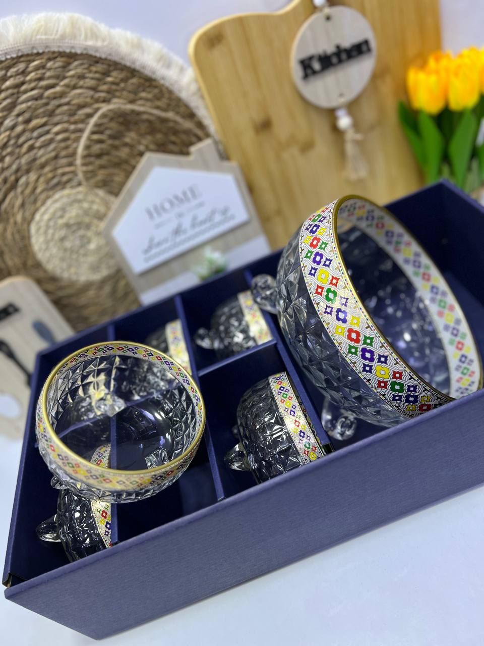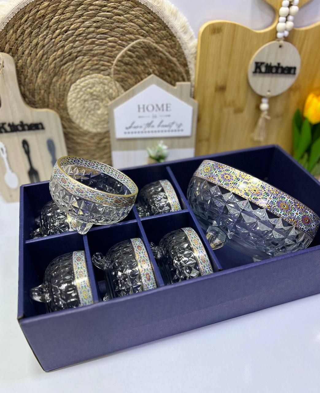 "Service de bols en verre avec motifs traditionnels colorés et bordure dorée
