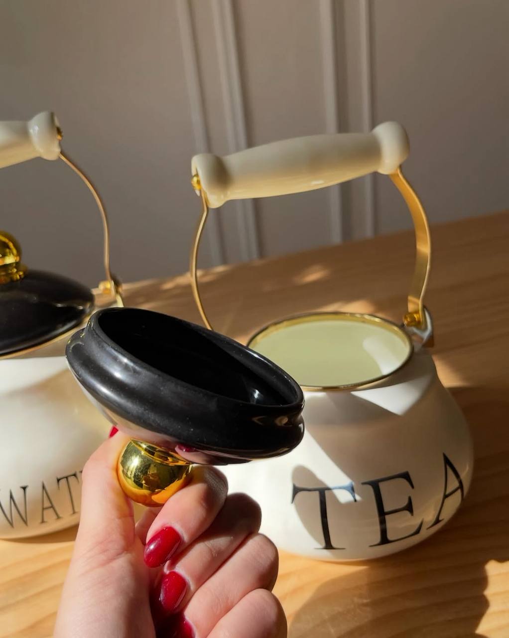 Théière élégante en céramique blanche, avec une anse dorée et un couvercle noir chic. Parfaite pour servir le thé avec style et ajouter une touche raffinée à votre cuisine. ✨